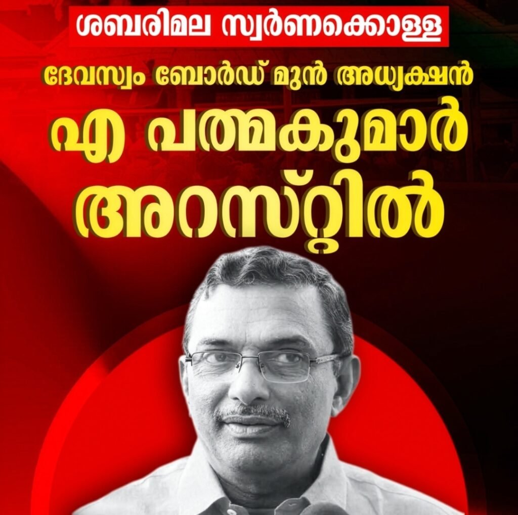 ശബരിമല സ്വർണമോഷണക്കേസ്: എ പത്മകുമാർ അറസ്റ്റിൽ
