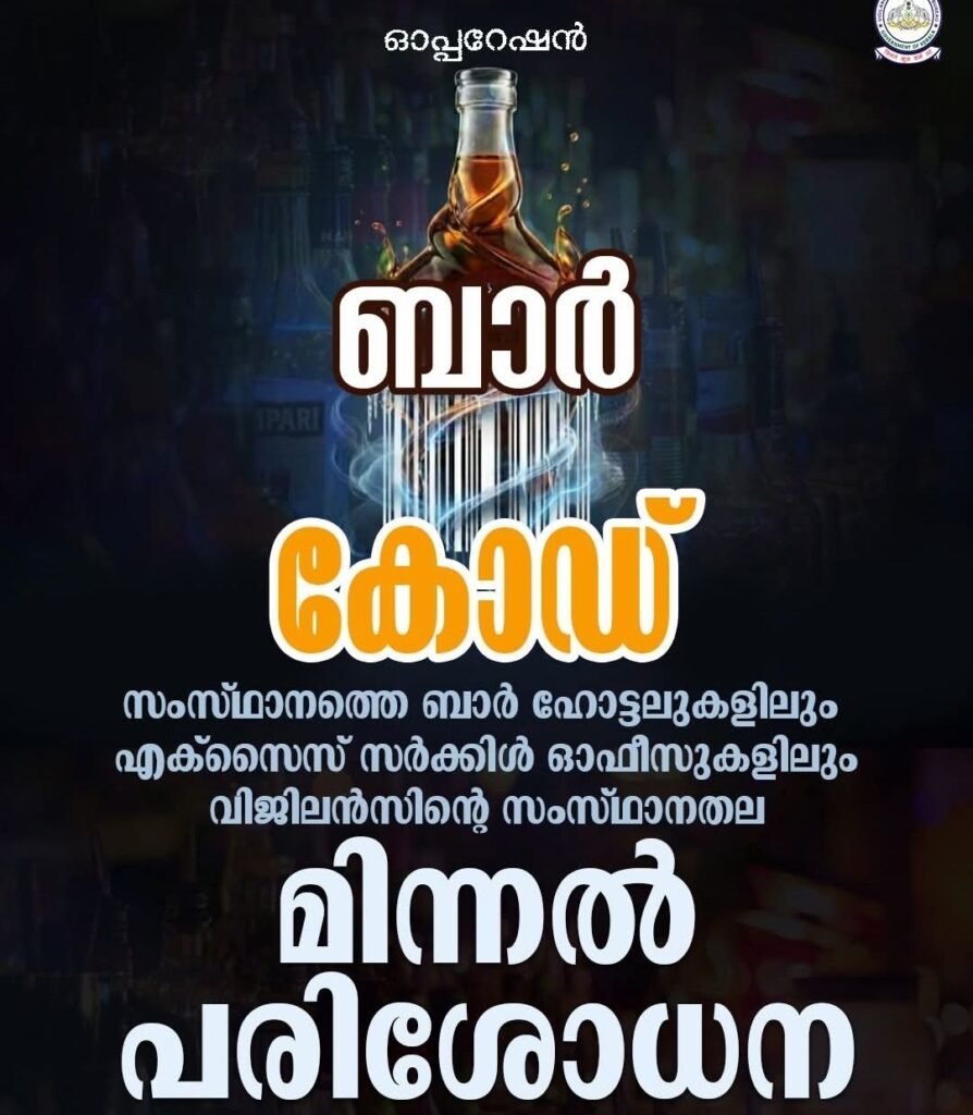 സംസ്ഥാനത്തെ ചില ബാർ ഹോട്ടലുകളിൽ “സെക്കന്റ്സ്” എന്ന പേരിൽ അനധികൃത/വ്യാജ മദ്യവിൽപ്പന നടക്കുന്നതായി ലഭിച്ച വിവരത്തിന്റെ അടിസ്ഥാനത്തിൽ, ഓപ്പറേഷൻ “ബാർ കോഡ്” എന്ന പേരിൽ വിജിലൻസ് സംസ്ഥാനതല മിന്നൽ പരിശോധന ആരംഭിച്ചു. ഇന്ന് രാവിലെ 10 മണി മുതൽ 66 ബാർ ഹോട്ടലുകളിലും ബന്ധപ്പെട്ട എക്സൈസ് സർക്കിൾ ഓഫീസുകളിലുമാണ് പരിശോധന.