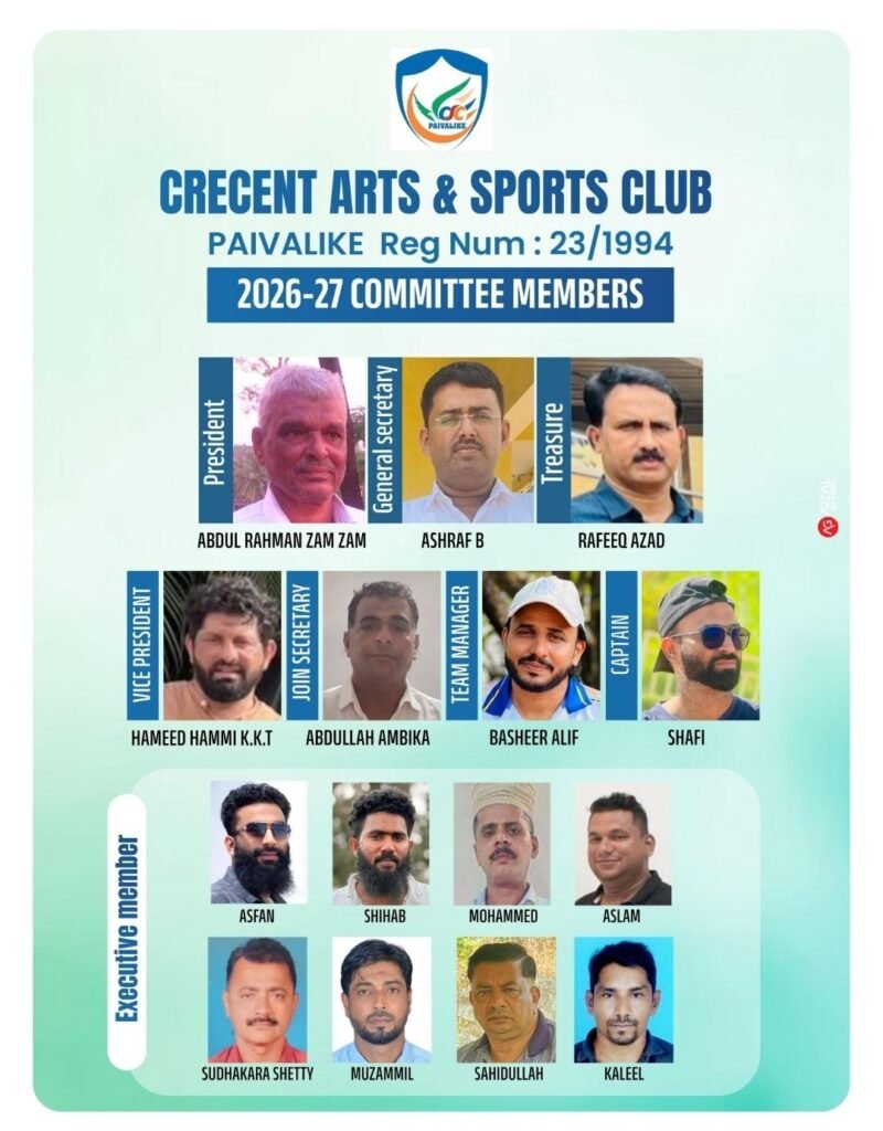 പൈവളികെയുടെ സാമൂഹിക-സാംസ്കാരിക-കായിക ജീവിതത്തിൽ നിർണായക പങ്കുവഹിക്കുന്ന ക്രസന്റ് ആർട്സ് & സ്പോർട്സ് ക്ലബ് (Reg. No: 23/1994)യുടെ 2026–27 വർഷങ്ങളിലേക്കുള്ള പുതിയ കമ്മിറ്റി ഔദ്യോഗികമായി പ്രഖ്യാപിച്ചു. അനുഭവസമ്പത്തും യുവത്വത്തിന്റെ ഊർജവും ഒരുമിച്ചുള്ള ഈ നേതൃത്വസംഘം ക്ലബ്ബിന്റെ ചരിത്രത്തിൽ പുതിയ അധ്യായം കുറിക്കുമെന്ന പ്രതീക്ഷയിലാണ് അംഗങ്ങളും നാട്ടുകാരും.