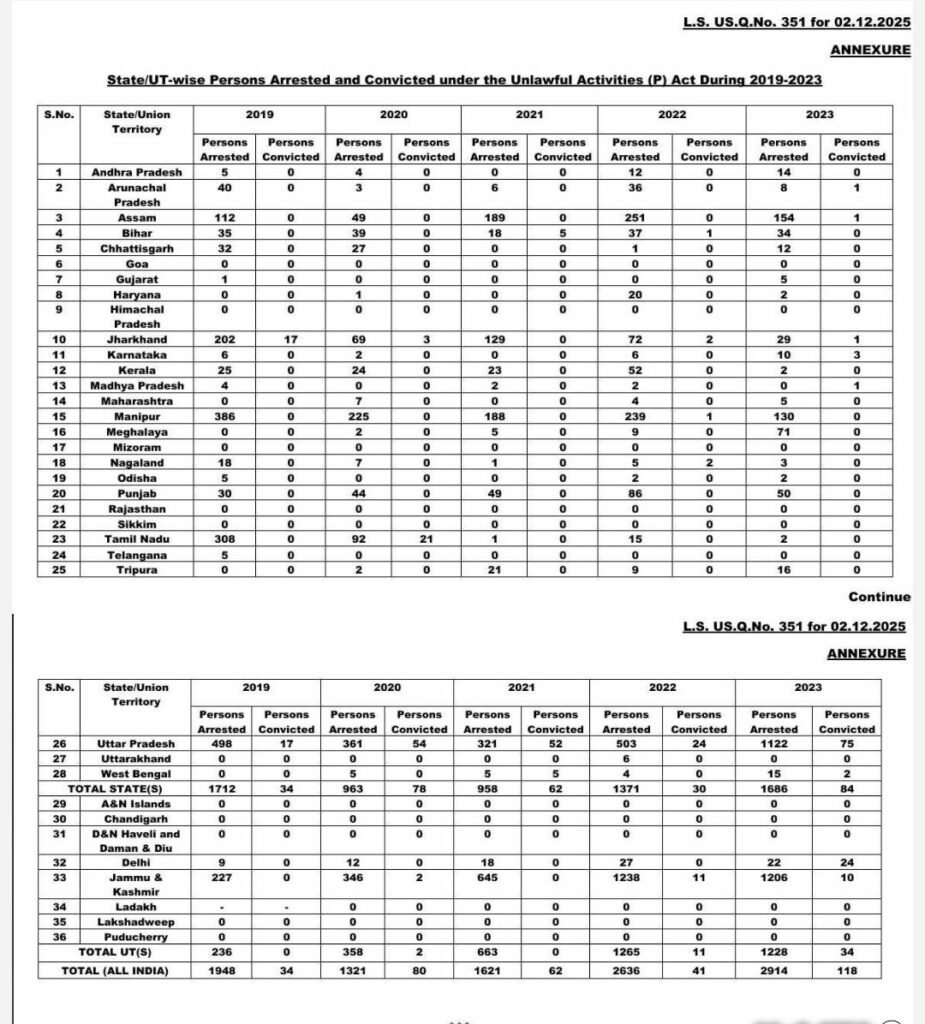 2025 ഡിസംബർ 2-ന് ലോക്സഭയിൽ ഉന്നയിച്ച അൺസ്റ്റാർഡ് ചോദ്യം നമ്പർ 351 ന് കേന്ദ്ര സർക്കാർ നൽകിയ എഴുത്തുപരമായ മറുപടിയിൽ ഉൾപ്പെടുത്തിയ Annexure പ്രകാരം, 2019 മുതൽ 2023 വരെയുള്ള അഞ്ചുവർഷ കാലയളവിൽ ഇന്ത്യയിലുടനീളം 10,440 പേരെയാണ് UAPA നിയമപ്രകാരം അറസ്റ്റ് ചെയ്തിരിക്കുന്നത്.