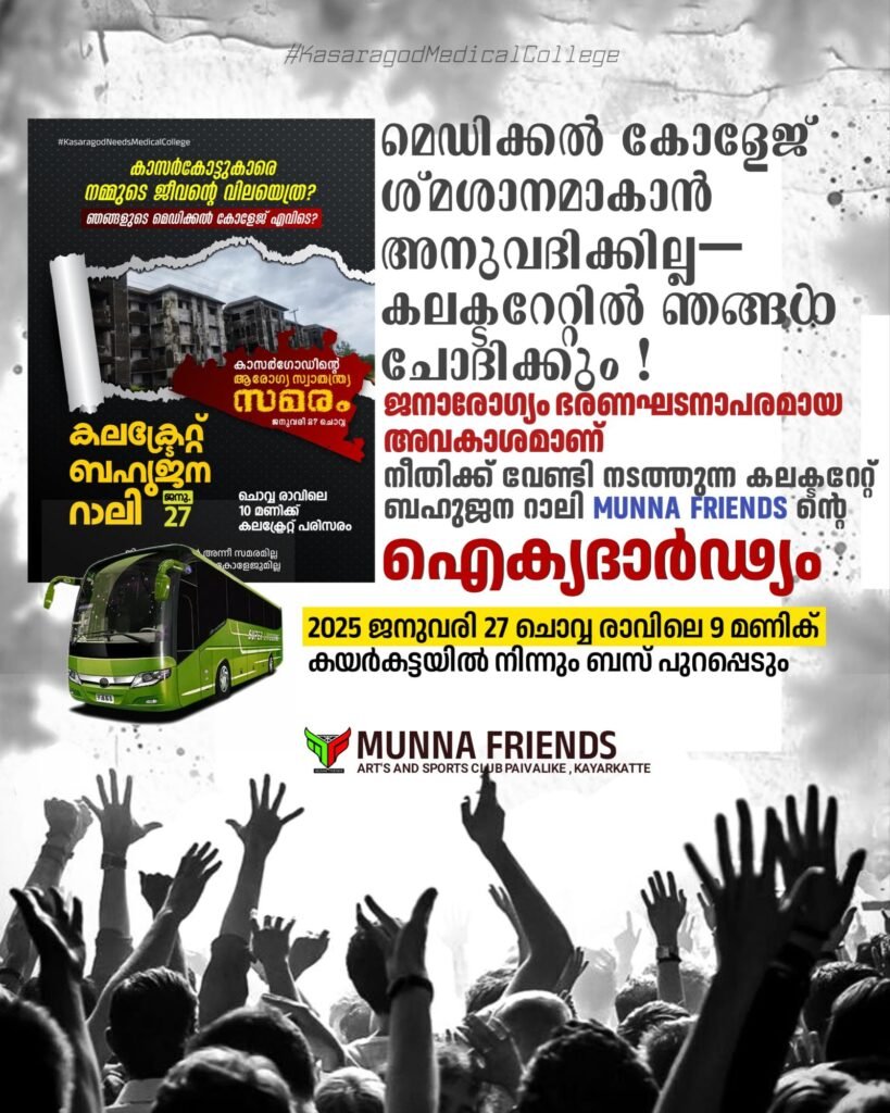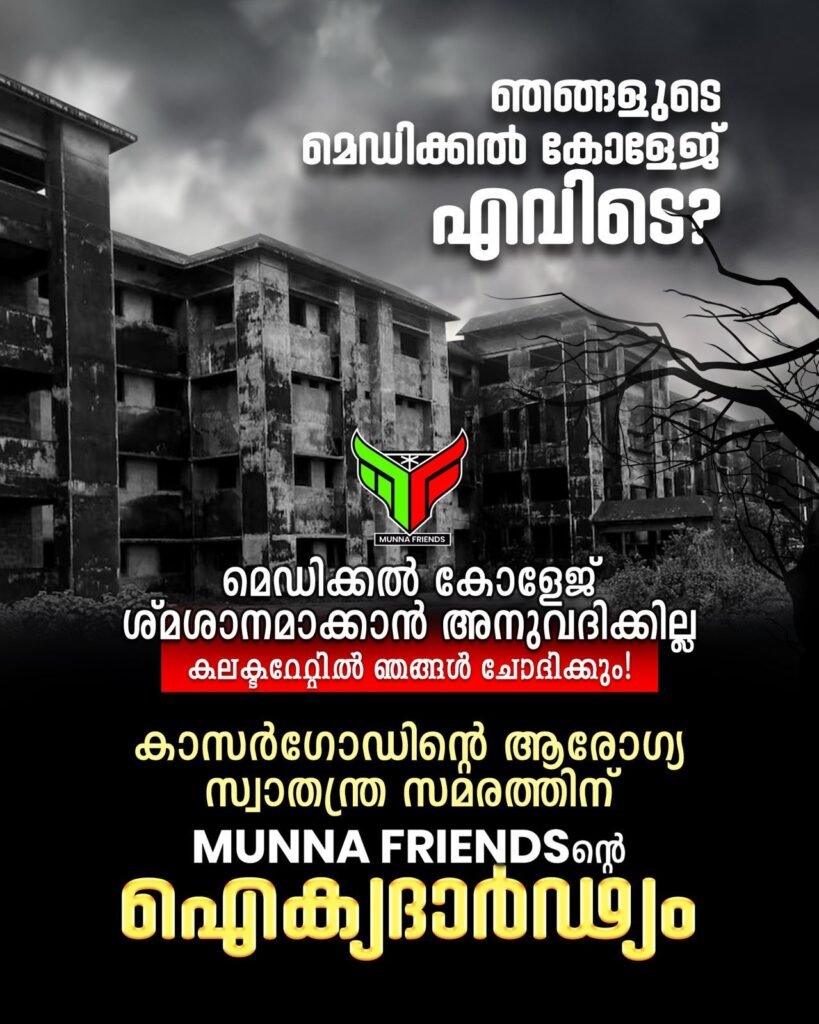 “ഞങ്ങളുടെ മെഡിക്കൽ കോളജ് എവിടെ?” എന്ന ചോദ്യം കാസർകോട് ജനത വർഷങ്ങളായി ഉന്നയിക്കുകയാണ്. എന്നാൽ വ്യക്തമായ സമയപരിധിയും ഉത്തരവാദിത്തപരമായ നടപടികളും സർക്കാർ ഇതുവരെ സ്വീകരിച്ചിട്ടില്ലെന്ന് മുന്ന ഫ്രണ്ട്സ് പറഞ്ഞു.